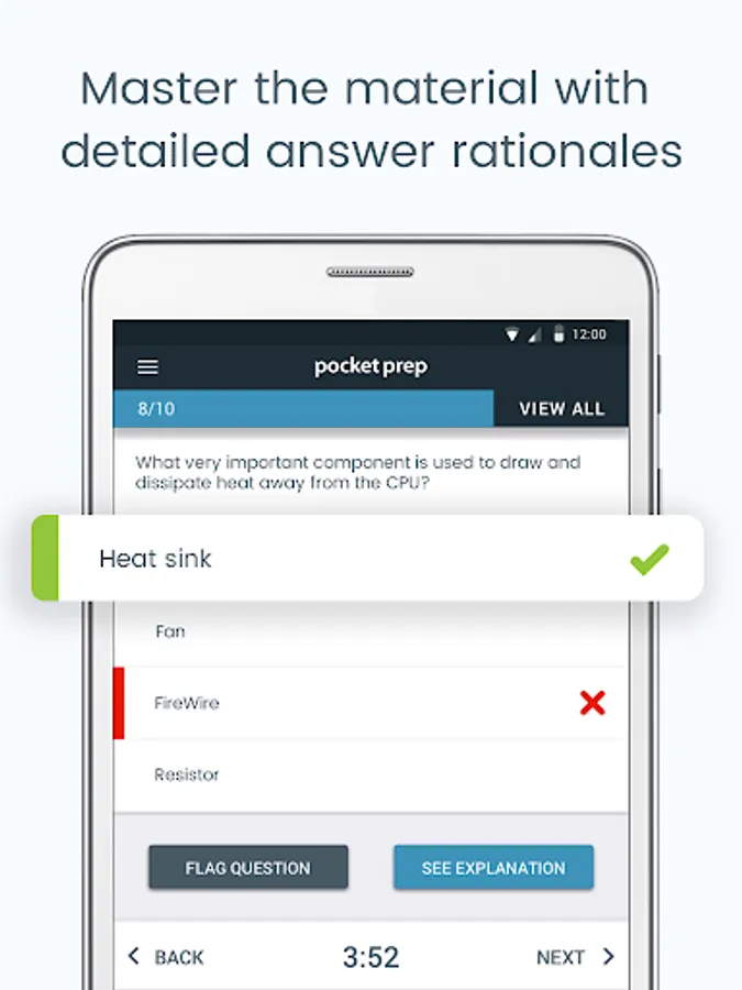 Pocket Prep’s CompTIA A+ practice test app is a powerful exam simulator that allows you to create customized practice tests with detailed answer explanations for every question. View your results and exam history with just a few taps. Study anywhere, anytime without Internet connectivity.