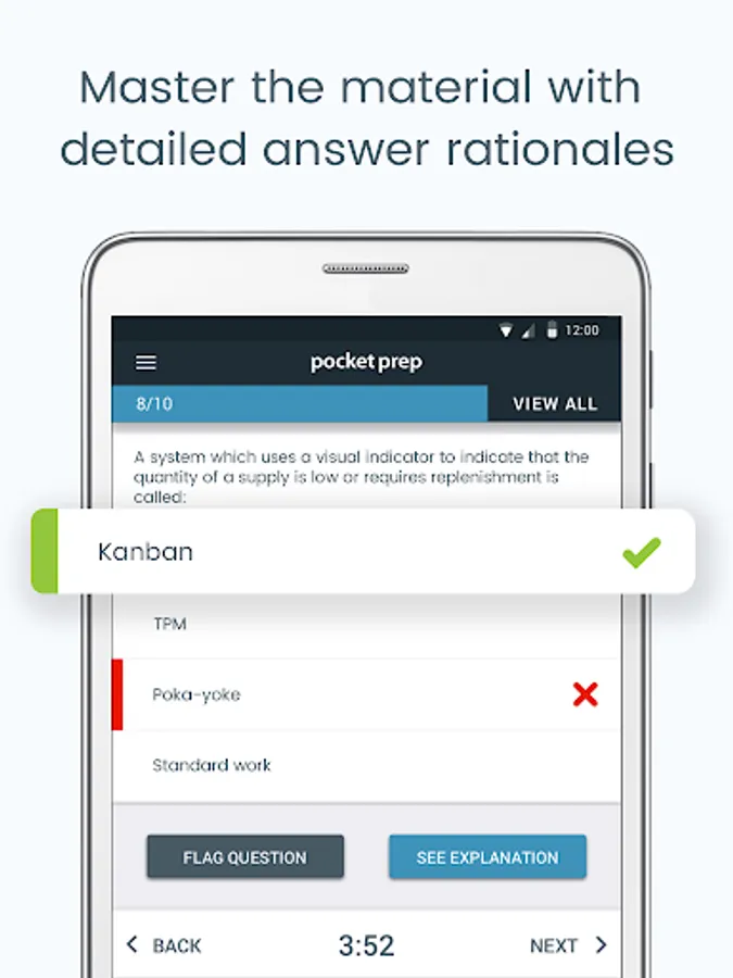 Pocket Prep’s ASQ Six Sigma Green Belt practice test app is a powerful exam simulator that allows you to create customized practice tests with detailed answer explanations for every question. View your results and exam history with just a few taps. Study anywhere at any time without Internet connectivity.