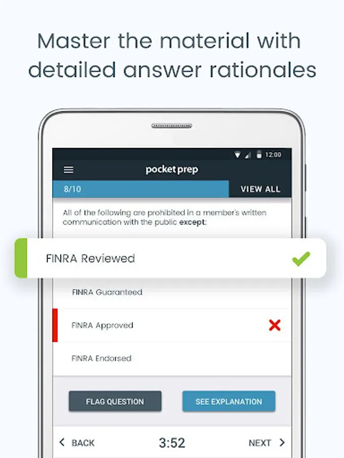 Pocket Prep’s Series 6 practice test app is a powerful exam simulator that allows you to create customized practice tests with detailed answer explanations for every question. View your results and exam history with just a few taps. Study anywhere, anytime without Internet.