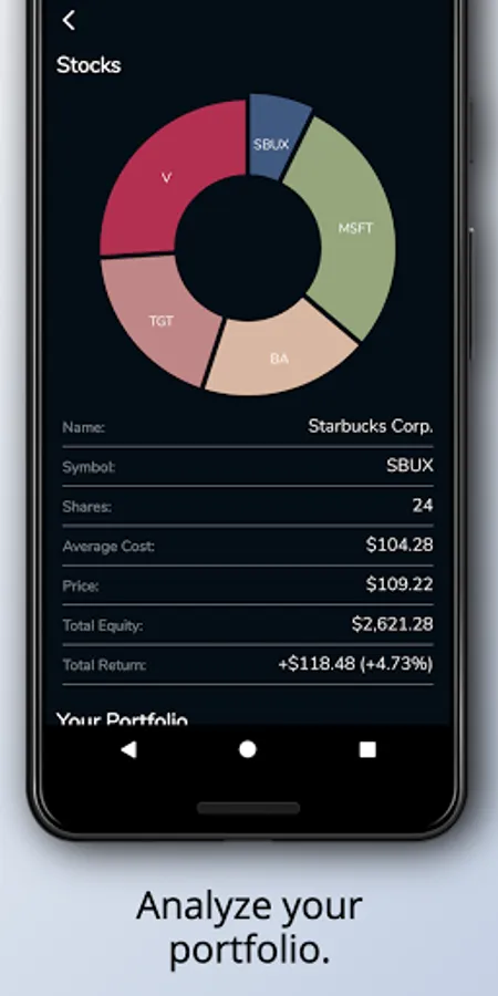• Account Statement: Get key statistics on the performance of your investments. PocketProfit leverages pie chart visualizations to describe your portfolio allocation.