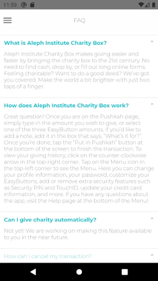 Aleph Institute Charity Box app makes giving easier and faster by bringing the charity box to the 21st century. No need to find cash, bring your charity box to The Aleph Institute, or fill out long online forms. Feeling charitable? Want to do a good deed? We’ve got you covered. Make the world a bit brighter with just two taps of a finger. Simply select the amount you wish to give, add an optional note, and you’re done!