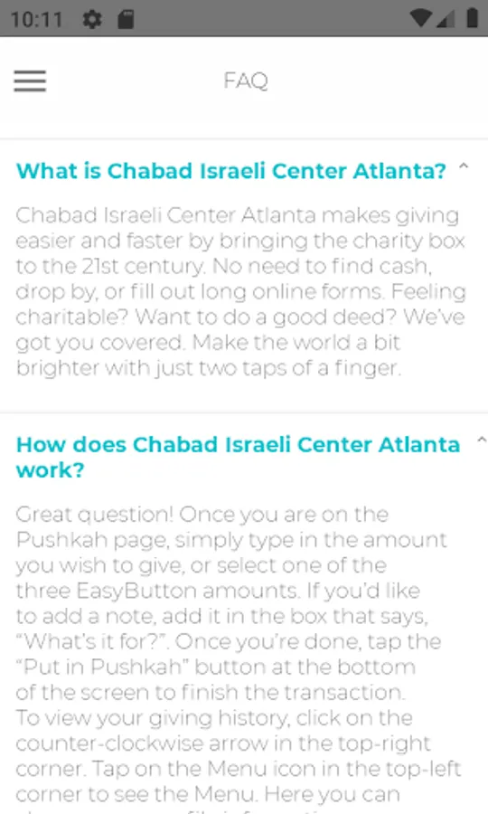 Chabad Israeli Center Atlanta Tzedakah makes giving easier and faster by bringing the charity box to the 21st century. No need to find cash, bring your charity box to Chabad, or fill out long online forms. Feeling charitable? Want to do a good deed? We’ve got you covered. Make the world a bit brighter with just two taps of a finger. Simply select the amount you wish to give, add an optional note, and you’re done.