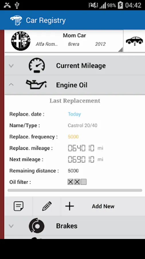 - Mileage update and current mileage and adjustable reminder notifications to update mileage.