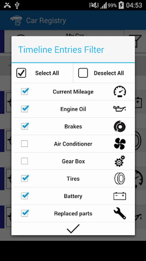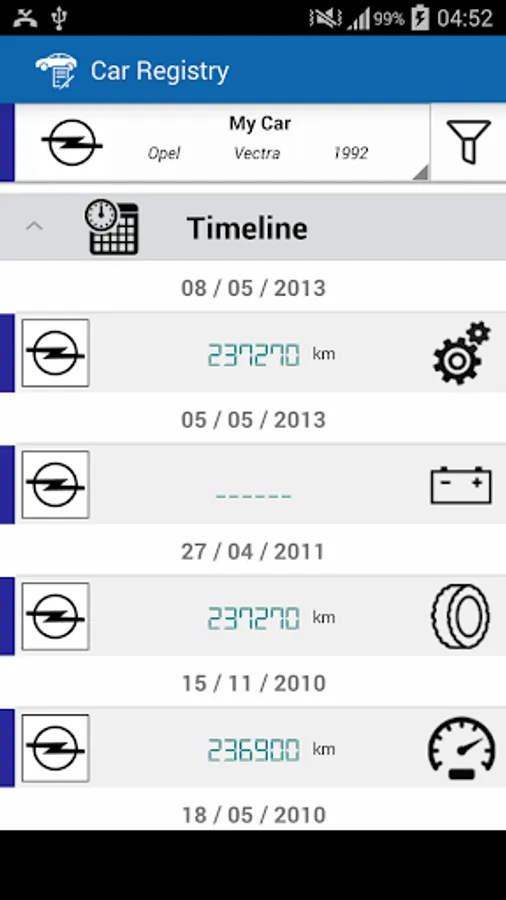 * CarG - Car Management App has a simple timeline screen to show all the entries or specific number of entries for one car or for all of your cars.