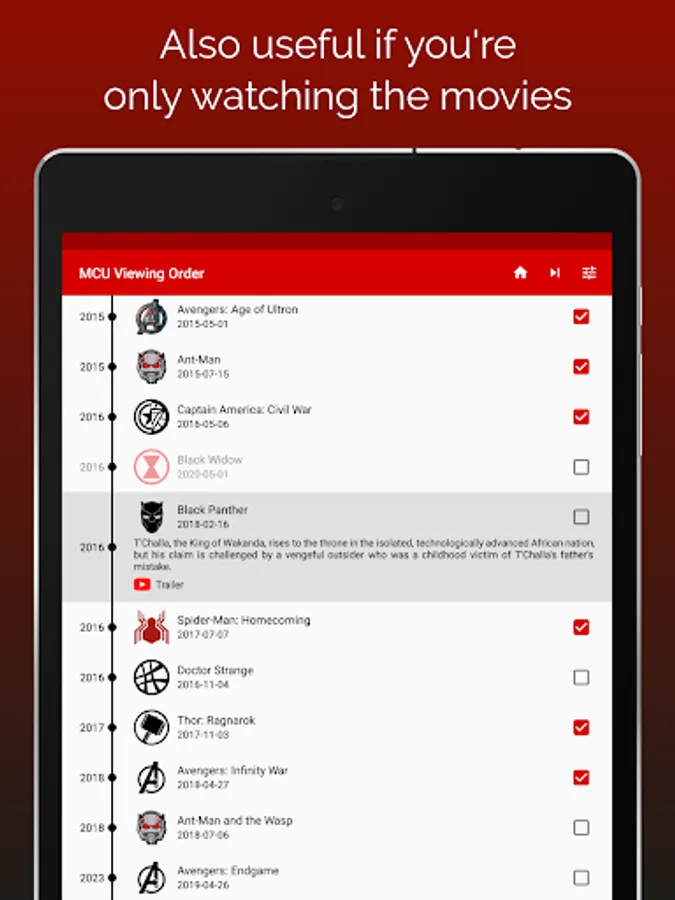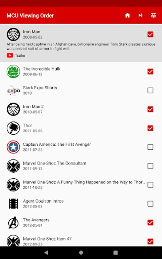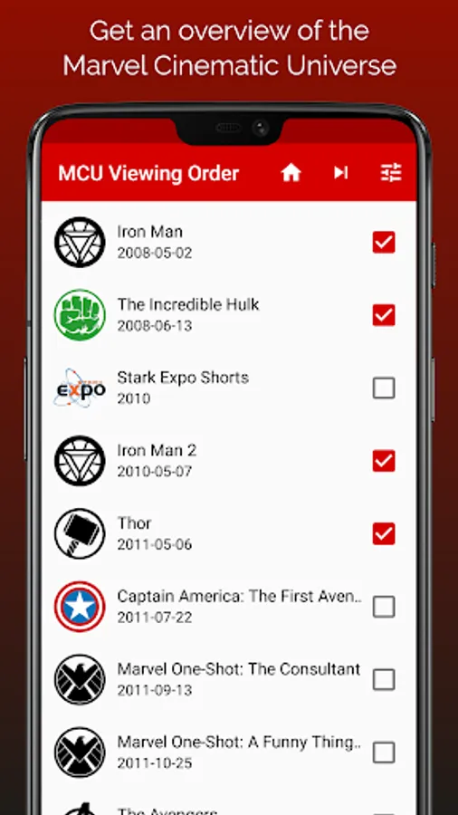 Iron Man • The Incredible Hulk • Thor • Captain America • The Avengers • Guardians of the Galaxy • Ant-Man • Doctor Strange • Spider-Man • Black Panther • Captain Marvel • Black Widow