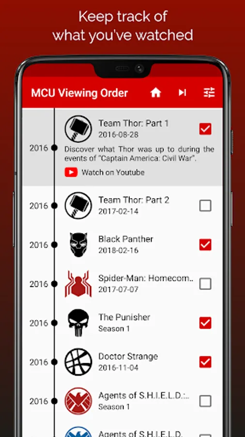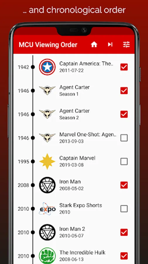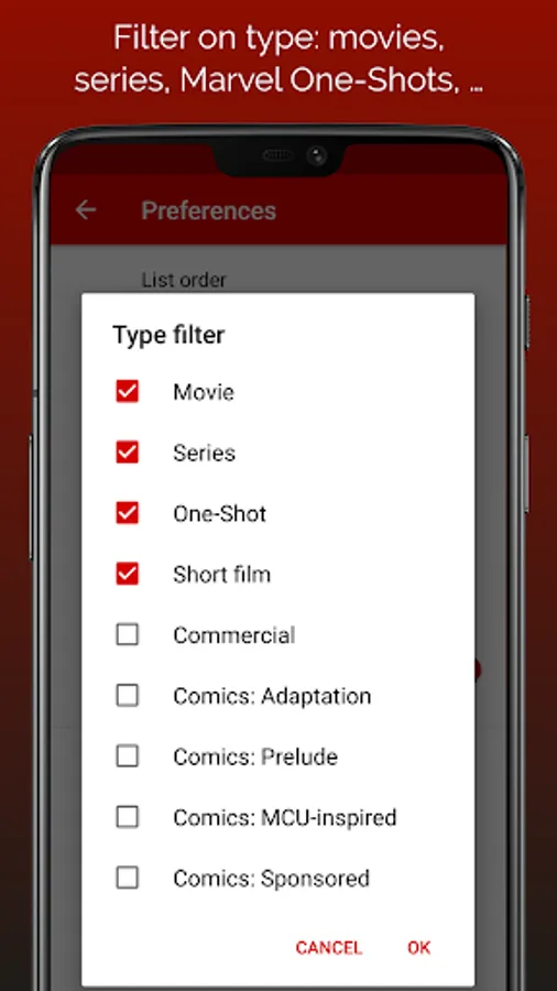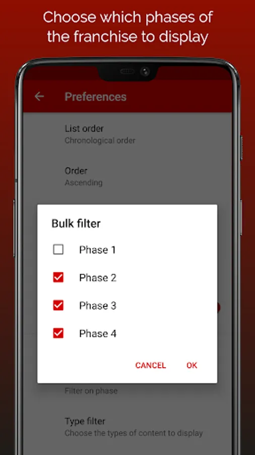 - Filter on phase and type (movies, series, Marvel One-Shots, comics, ...)