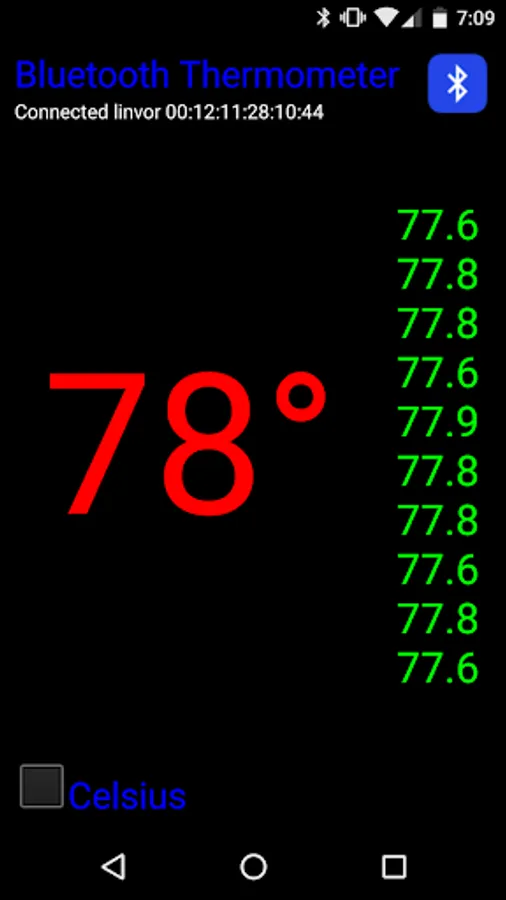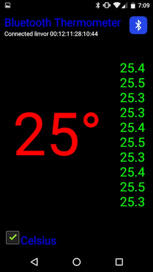 Bluetooth Thermometer displays temperature using a bluetooth enabled development board. The Android client connects to the bluetooth module and reads data streaming from an Arduino or a Raspberry Pi. Arduino code is available at www.PocketTutor.com
