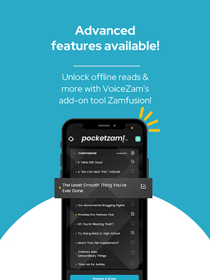 Sign into your VoiceZam account and add the optional Zamfusion tool inside your VoiceZam account to supercharge your PocketZam app - so you can ‘Zam interested parties with ALL of your online and offline demos and reads in a flash!