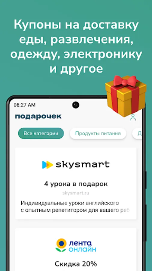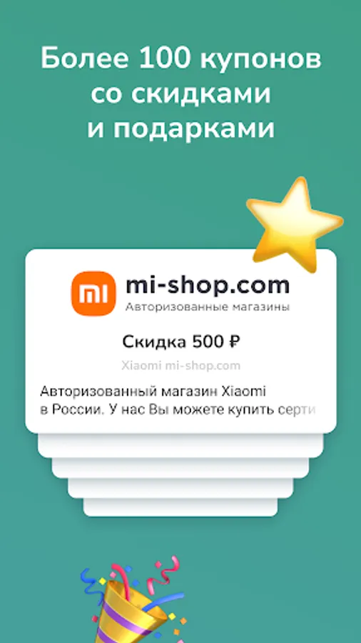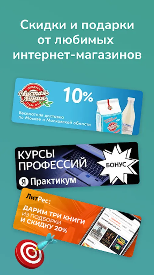 Over 100 coupons with up to 70% discounts on food delivery, groceries, entertainment, clothing and footwear, electronics and household appliances, pet supplies, household goods, health and sports, cosmetics and perfumes, jewelry and bijouterie, online courses, furniture, books and more.
