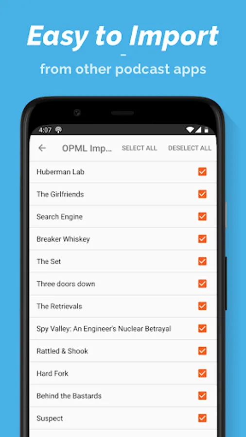 You can quickly transfer subscriptions from other podcast apps to our app by using OPML Import feature.
