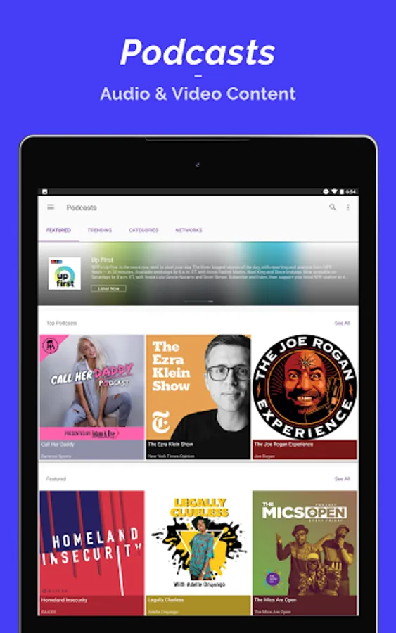 Fox News, Freakonomics Radio from Stitcher, Call Her Daddy, Phil in the Blanks by Dr. Phil, Bill O'Reilly, Today, Explained from Vox and Stitcher, S Town, The Luminary Agent Podcast, BBC iPlayer Radio, Criminal, Heaven's Gate from Stitcher, Dan Carlin's Hardcore History, ESPN Radio, My Favorite Murder, NPR, Radiolab, Serial, Sleep with Me, Stuff You Should Know, Sword and Scale, TED Radio Hour, TEDTalks, The Dave Ramsey Show, LeVar Burton Reads from Stitcher, The Joe Rogan Experience, The Tim Ferriss Show, Wolverine from Marvel and Stitcher, Luminary podcast from Luminary.fm, Luminary Business with Todd Staples, Olympik iPlayer Podcasts, You are dead to me by BBC Sounds, Friday Night Comedy from BBC iPlayer Radio, Brexitcast by BBC Sounds and iPlayer Radio, Comedy of the Week by BBC iPlayer Radio, etc.