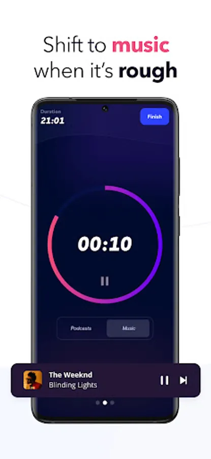 We built Shift because, like many of you, we love listening to podcasts while working out. However, it's not optimal when things get heavy. To cope with that we have built a technology that plays podcasts when you rest or recover, and automatically shifts over to music when you need it. We've put a lot of effort into making it work without ever having to touch the phone. Just set up a timer and tap your headphones to shift.