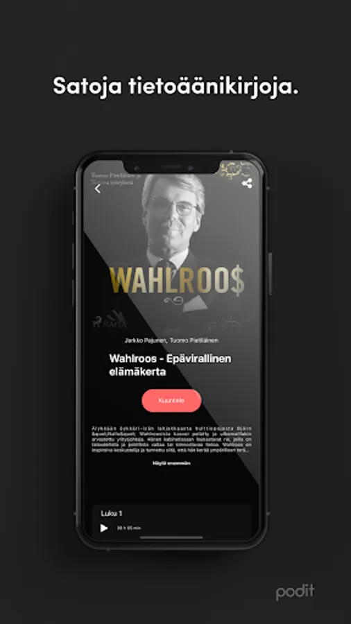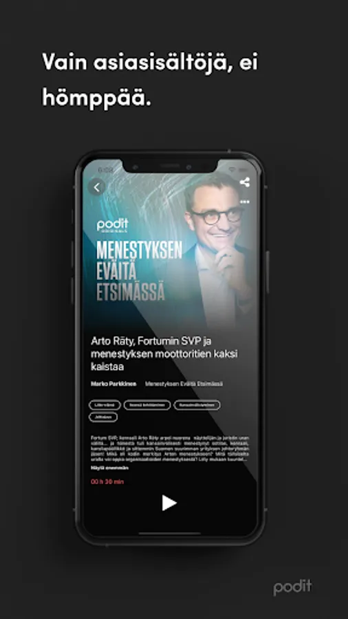Stay on time and develop yourself. Podit® brings together business and fact podcasts and audiobooks under one service and offers exclusive Podit Originals® podcasts delivered by front-line business people.