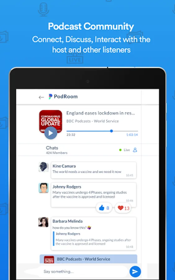Created by podcast lovers, PodRoom is the podcast community app with genres such as Education, lifestyle, politics, comedy, religion and many more.