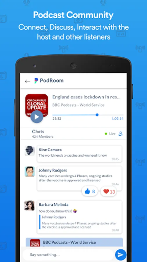 PodRoom is a podcast app on Android with a great social networking platform for the Podcast Community.