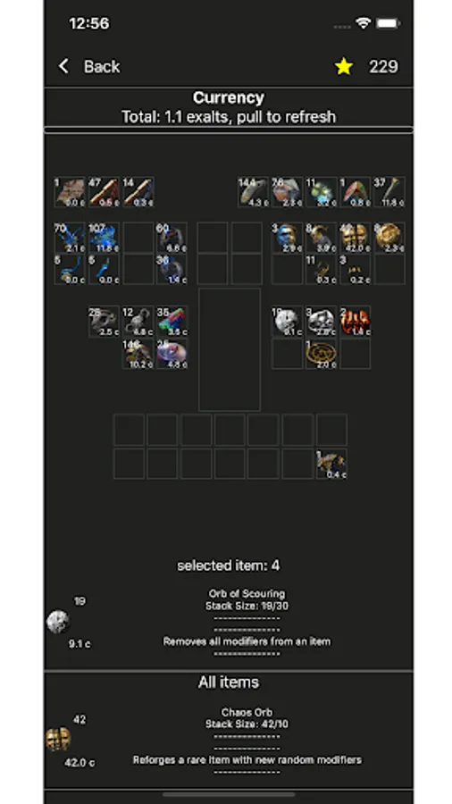 Check the price of all your path of exile items (uniques, rares, currency, gems, maps, etc.) in all stash tabs. Flag the locations of the valuable items according to the threshold you set.