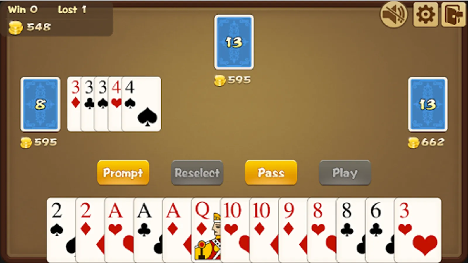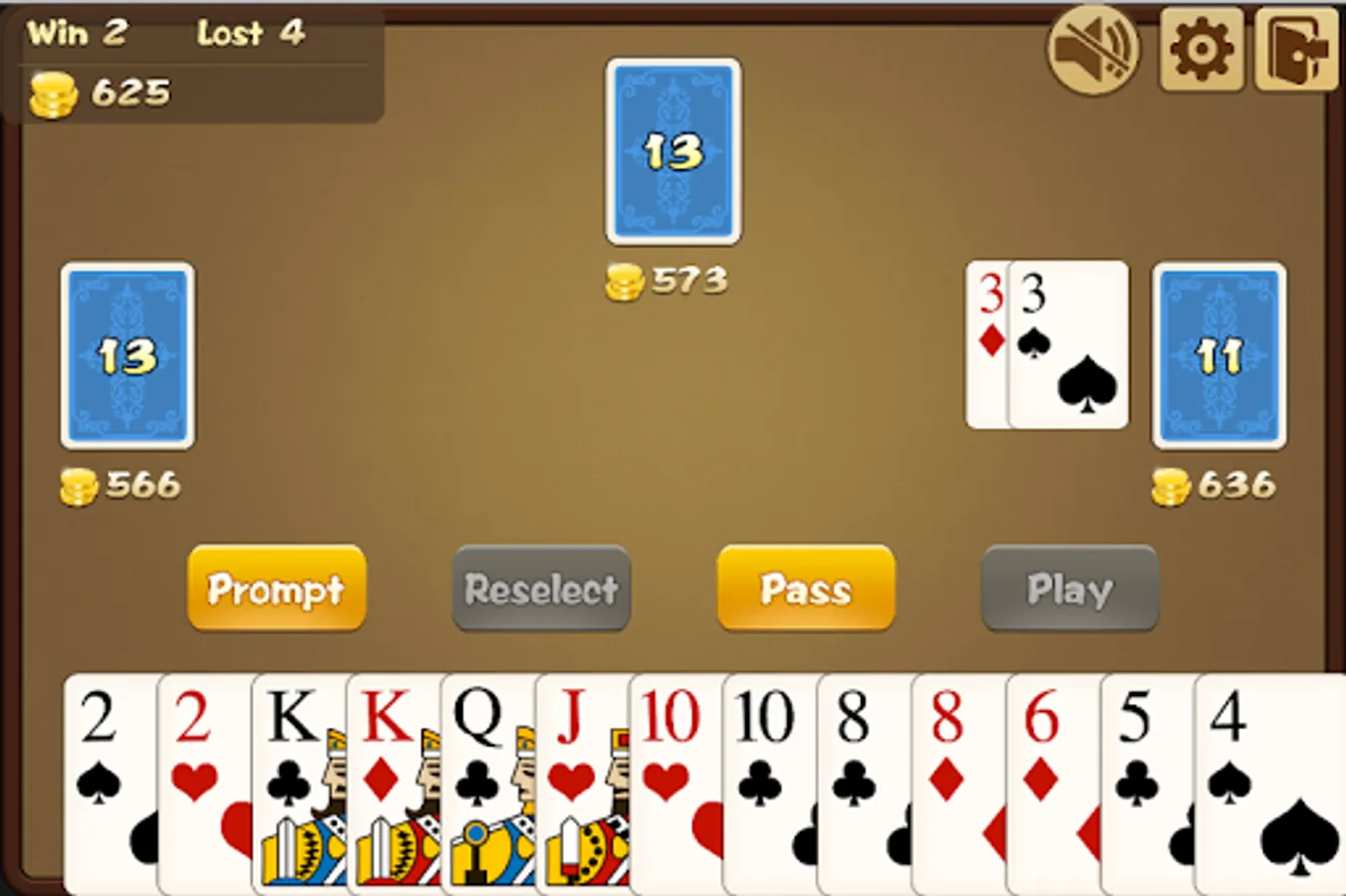 Big 2 is a popular poker game, with rules easy to learn. It is very dynamic and exciting intense. Each player plays for himself, but it need to cooperate with each other as much as possible to achieve the greatest benefit. The relationship between the enemy an ourselves is rapidly changing. n The one who gets diamond 3 plays first, and the card he or she plays should include diamond 3. The active player can bing out any cards he or she wants, but the one who follows should only bring out cards which are larger than the active player`s. It`s your turn but you don`t want to bring out any cards or you have no cards to play with,choose pass for next player. The player who freed cards first and foremost is the winner of this game.n The cards are displayed in such sequential orders: 2>A>K>Q>J>10>9>8>7>6>5>4>3,Spade>Heart>Diamond>Club. When number of the cards equal, we compare with suits.n Types of cards in the game:(1)Single: a single card;(2)Pair: two cards with the same number;(3)Three: three cards with the same number;(4)Straight:five sequential cards;(5)Straight flush:five sequential cards with same suit;(6)Five same suits:but not straight flush, example heart '278JK';(7)Three with a pair:for example 99955;(8)Four with a single:for example 4444K.(9)Dragon:thirteen sequential cards,A2345678910JQK.
