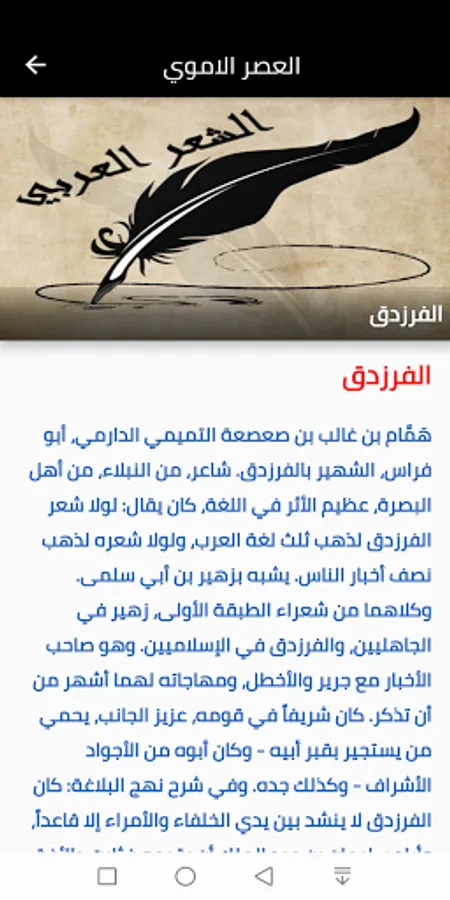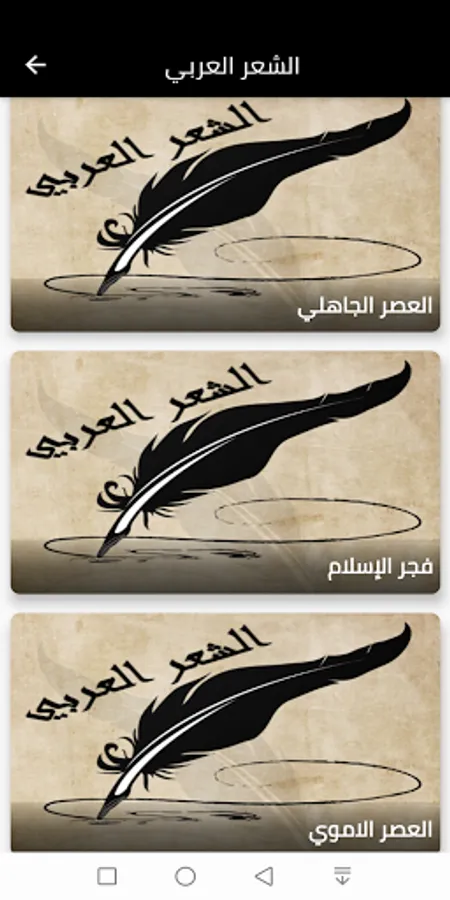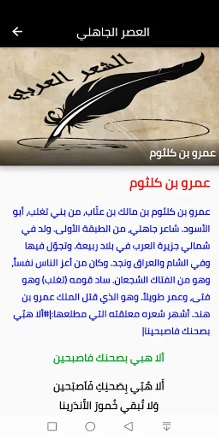 The application of Arabic poetry contains the most beautiful Arabic poems from different eras, such as the Islamic era, the Abbasid era, the Umayyad and the Jahili era. The application also contains an introduction to the most famous poets of those ages, such as Amru al-Qais, Antara bin Shaddad, and Hassan bin .Thabit