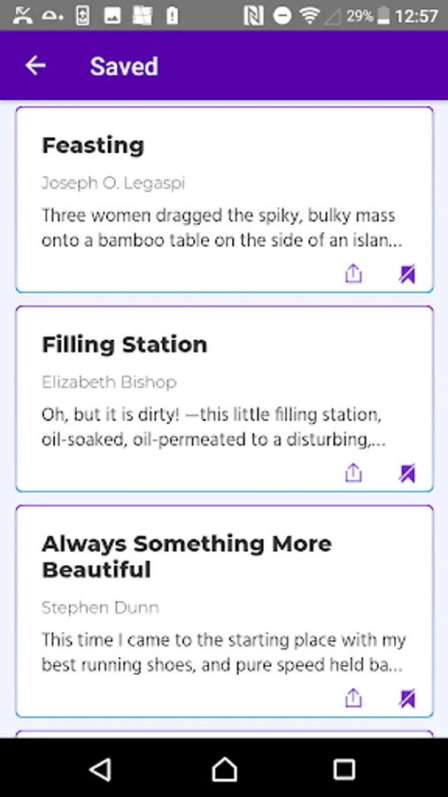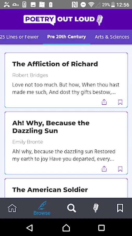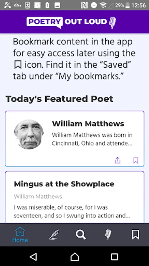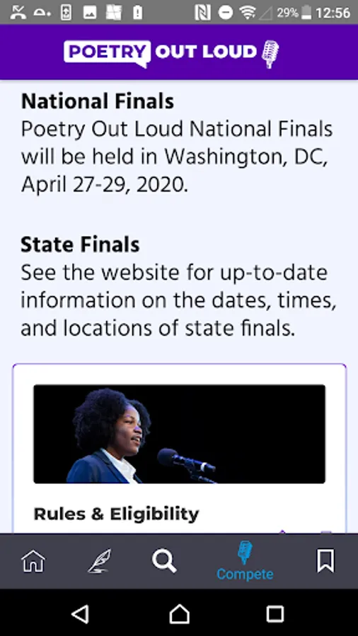 The app contains 1,000+ poems available to use in the competition. Use the bookmark feature to save them for quick access later when practicing your recitation. The Compete tab also contains all of the relevant information about participating in the contest.