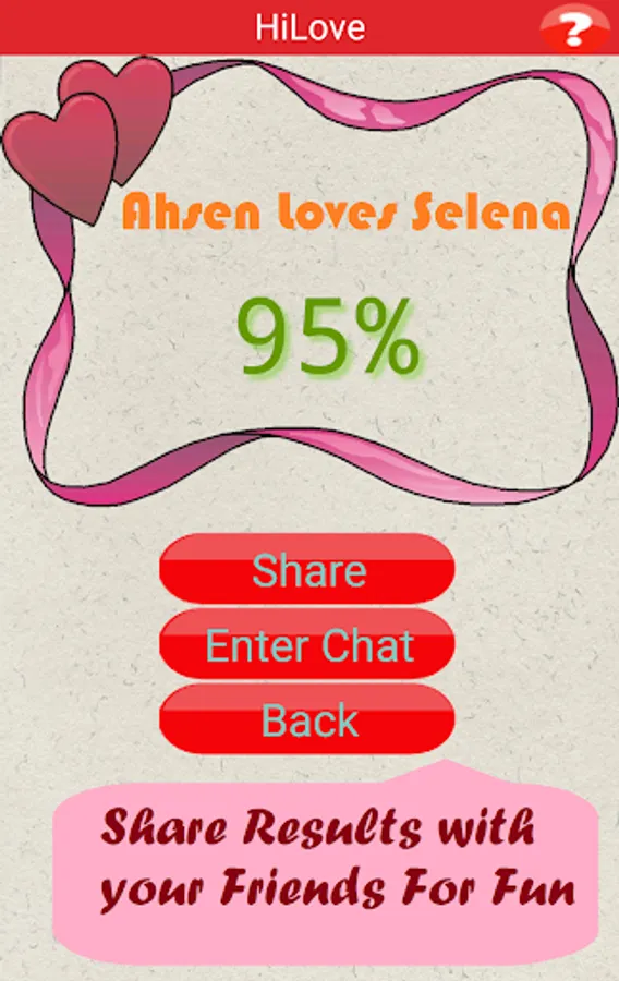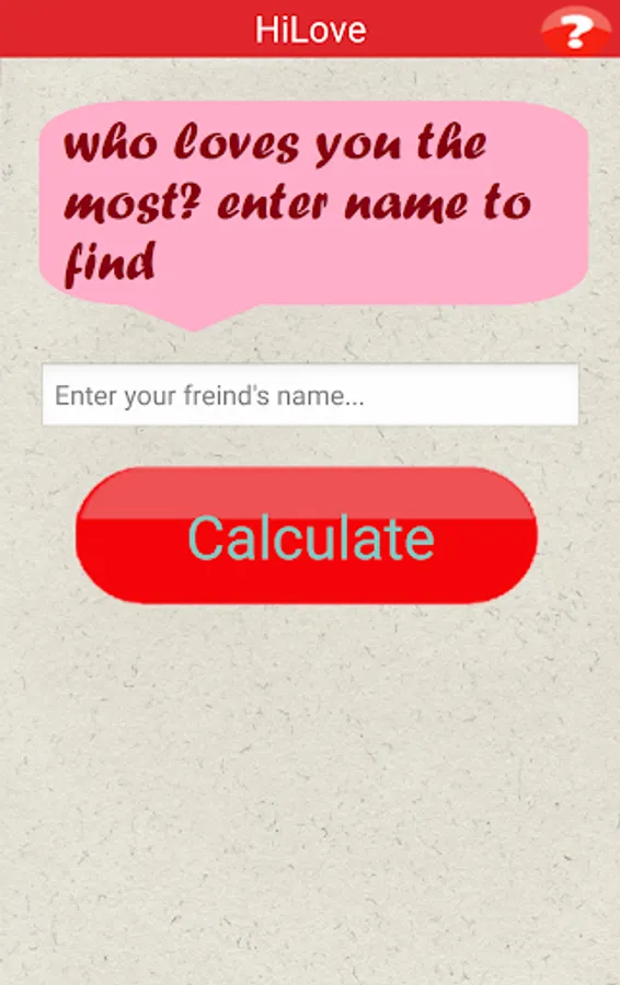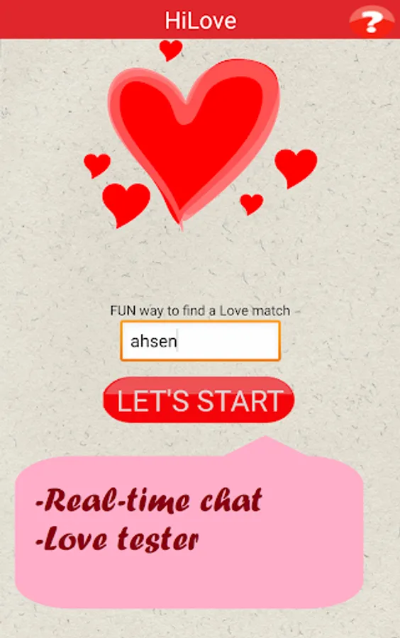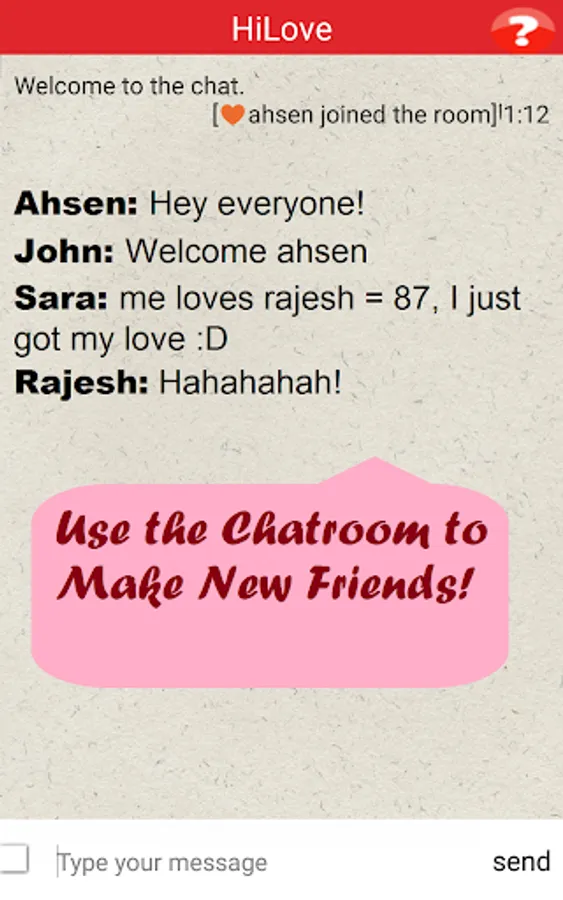 HiLove is a app in which if you are alone then use the chatroom and make friends there and calculate love percentage between your new friends!
