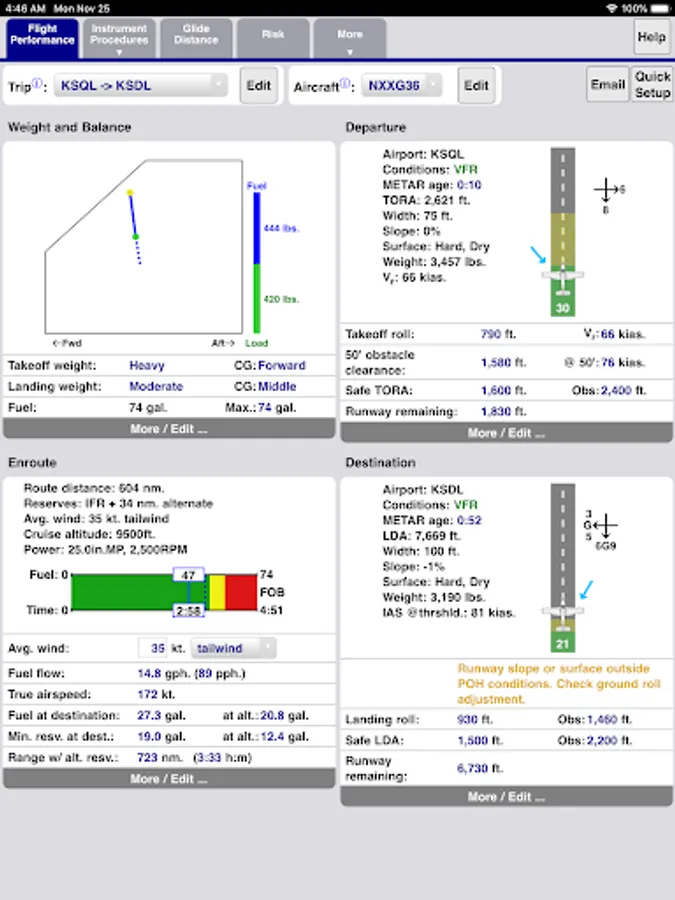 Bonanza Performance is also available on IOS devices and as a WebApp (an App that runs in a browser) that runs on a variety of platforms (PC, Mac, tablets, phones). The cloud sync feature allows flight planning profiles entered on any device to be synchronized with your other devices when connected.