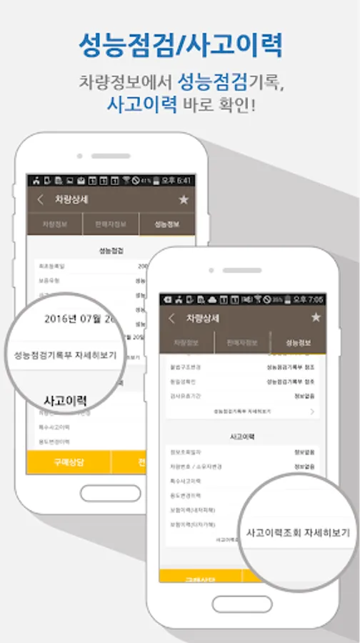 - 차량상세정보 : 각 매물에 대한 자동차상세정보, 성능점검, 사고이력, 판매자 정보 확인