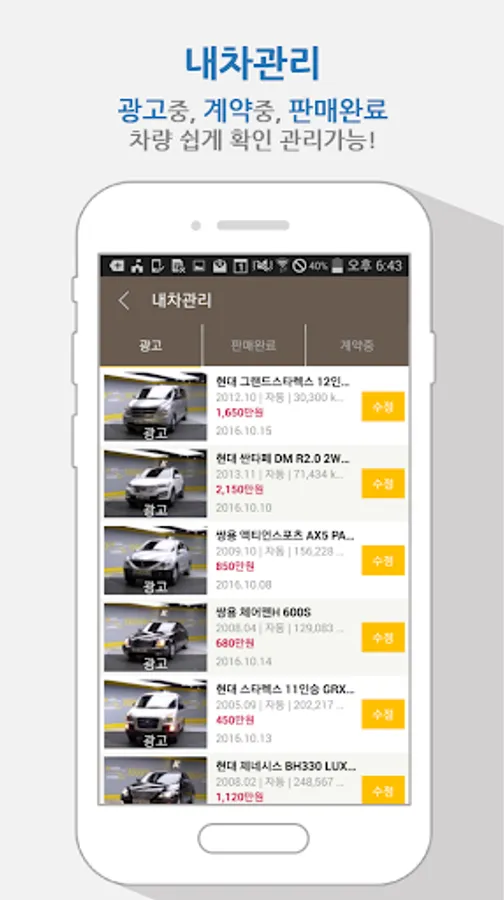- 내차관리 : 보유차량 광고중, 광고대기, 판매완료 내차관리가능