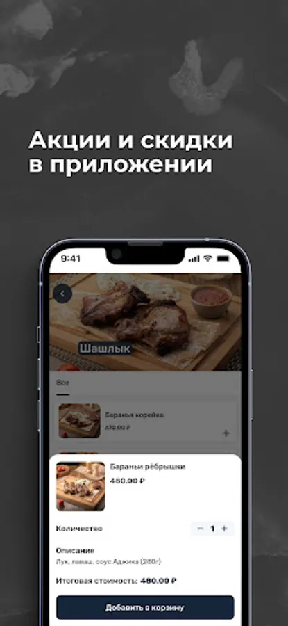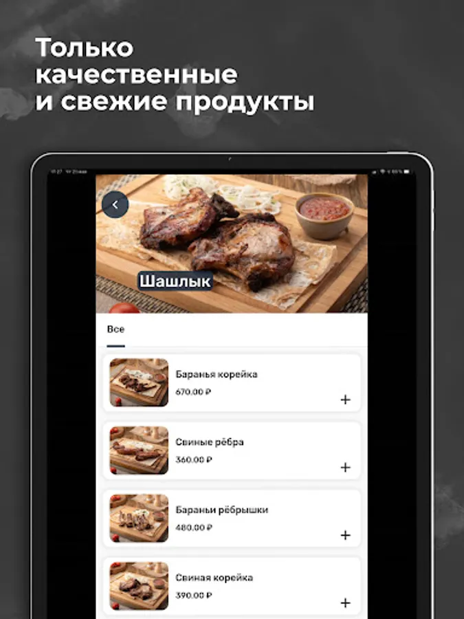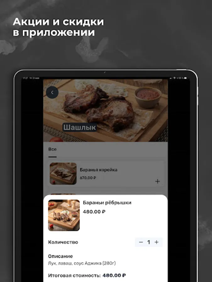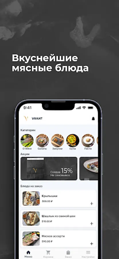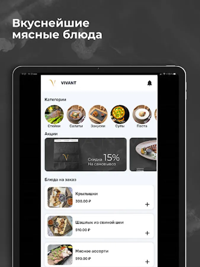 All users of the application can order the delivery of delicious dishes from the restaurant. Ordering food for self-pickup is carried out through the application with a discount!