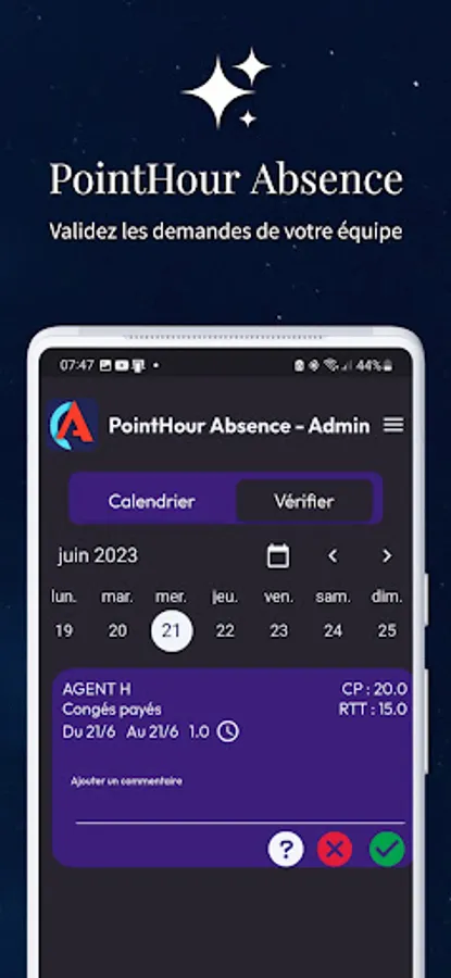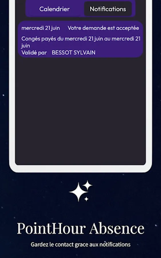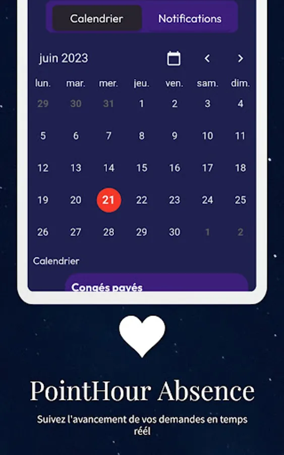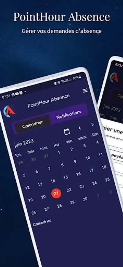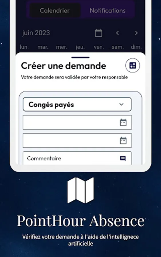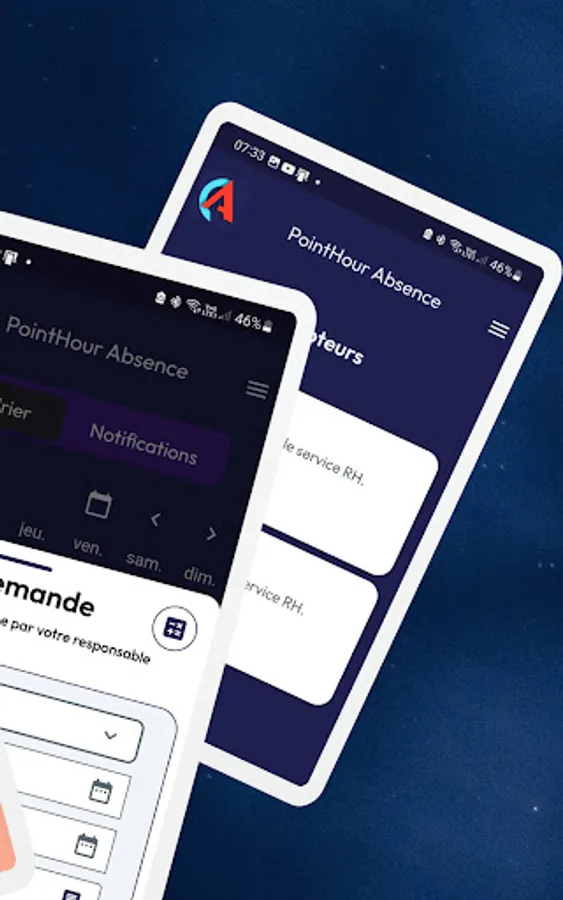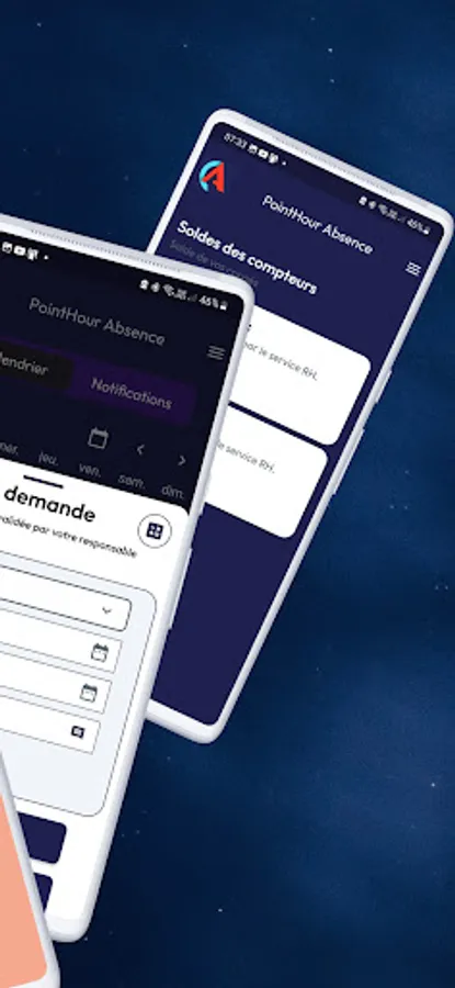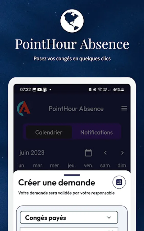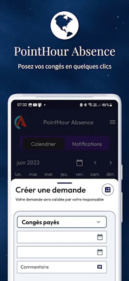 Absence declaration: Users can choose from different types of absence (paid leave, RTT, sick leave, etc.) and indicate the dates and duration of their absence. The application also offers a calendar for viewing periods already taken.