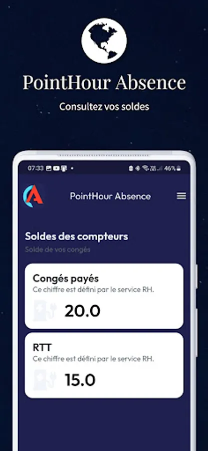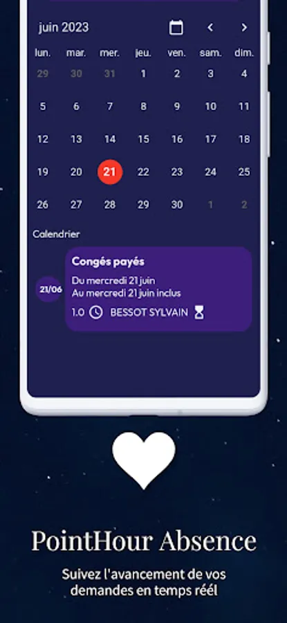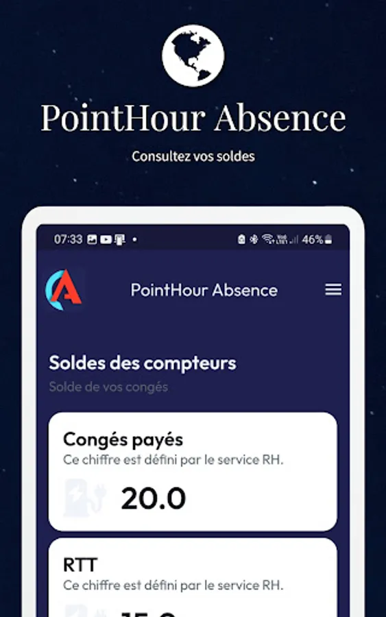 The PointHour Absence mobile application is a practical and efficient tool enabling employees to declare their absences directly from their phone. It also makes it quick and easy to consult paid leave and RTT balances.