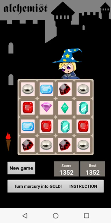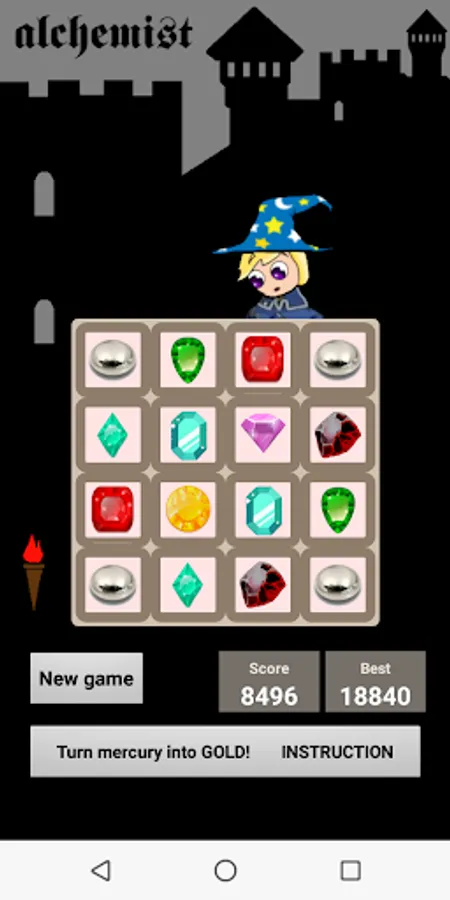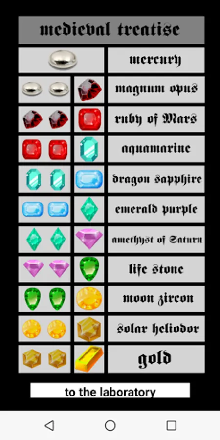 This game is a puzzle. In the dungeon of a medieval castle, an alchemist conducts experiments to obtain gold. When two parts of mercury are combined, a philosopher's stone (magnum opus) is obtained, when two philosophical stones are combined, a ruby of Mars is obtained, and so on, according to the found medieval treatise. To get gold, you need to connect two solar heliodors.