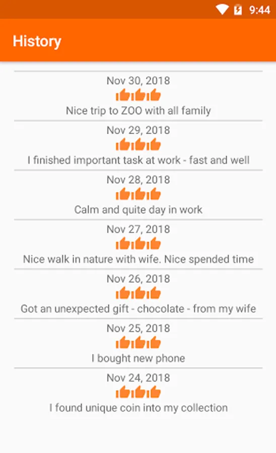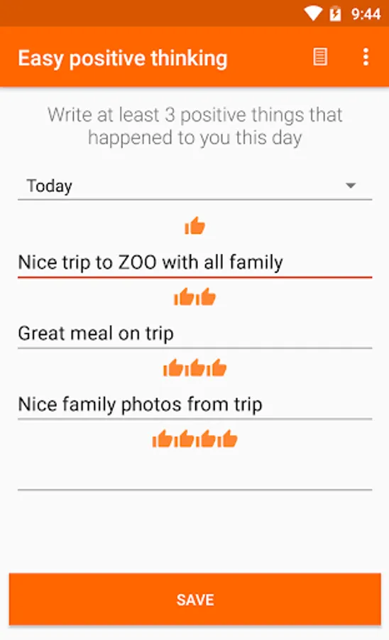 Your task will be to write every day at least 3 positive things that happened to you that day. Approximately after 21 days will start your brain preferentially seek positives while you create the habit of regular writing. This app is inspired by a lecture - Shawn Achor: The happy secret to better work (http://www.ted.com/talks/shawn_achor_the_happy_secret_to_better_work).