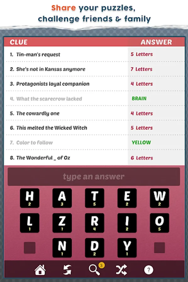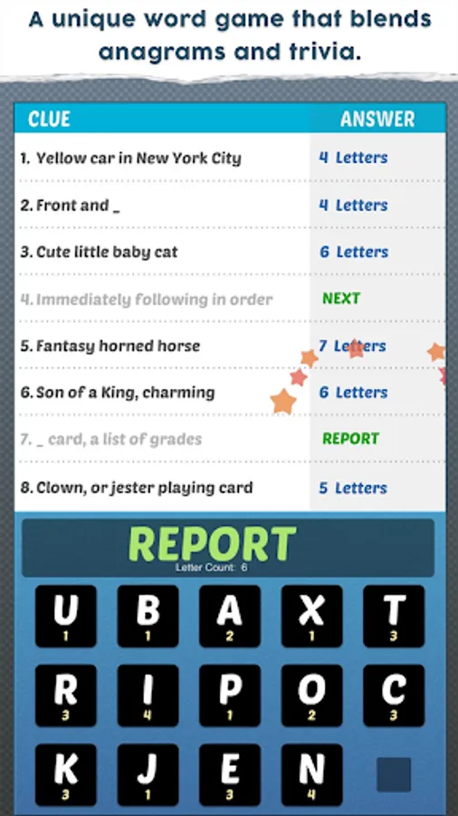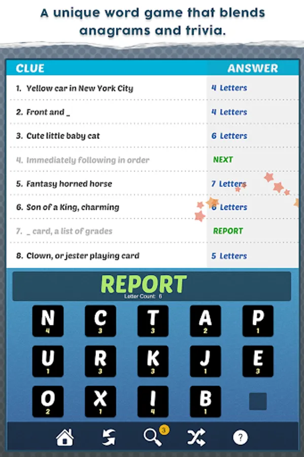 Clue Word is a blend of crosswords and anagrams. There are 8 clues for 8 words which can be solved using letters in a given bank.