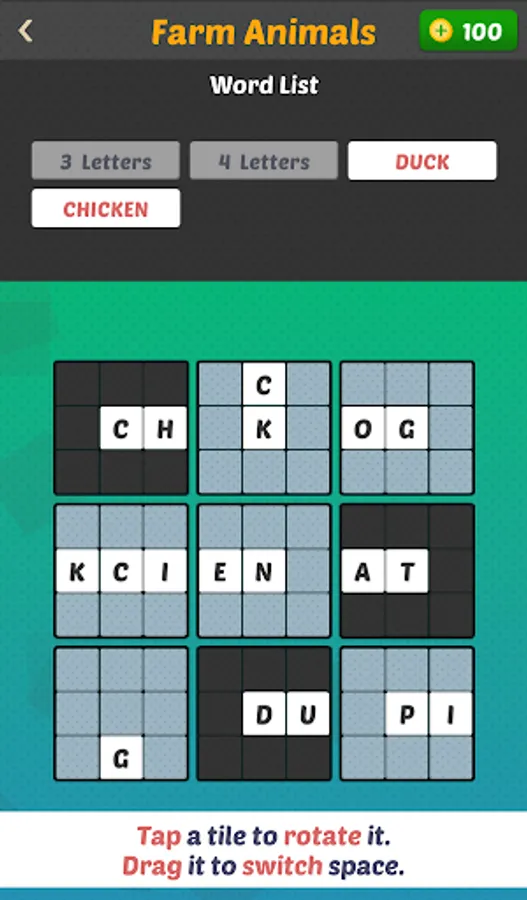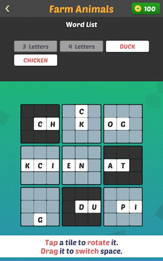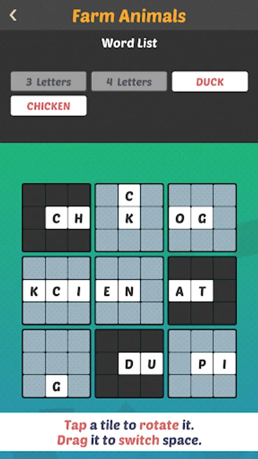 In Clue Word 2 the puzzle consists of a ‘broken’ crossword puzzle and the goal is to reconstruct it with the clues given. The crossword tile pieces can be rotated and swapped around the board.