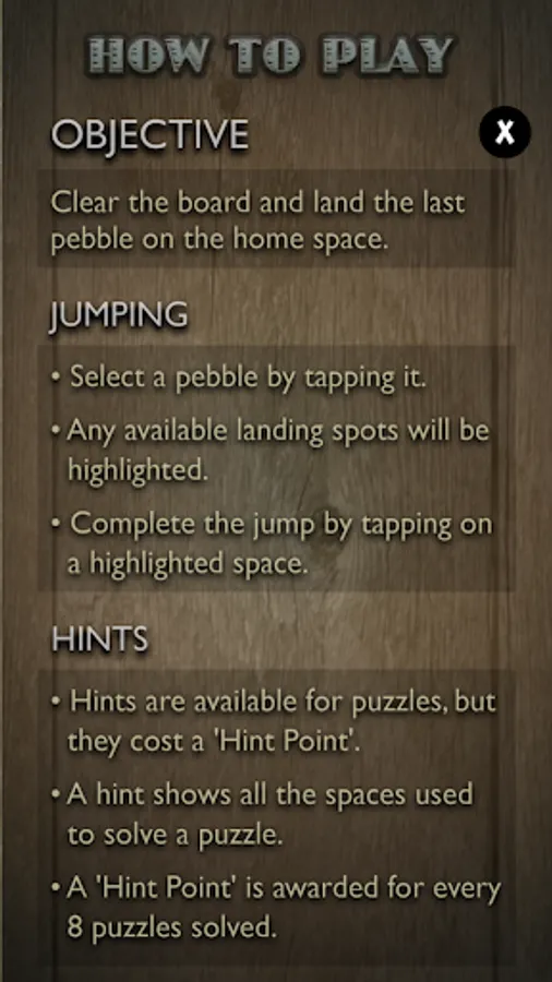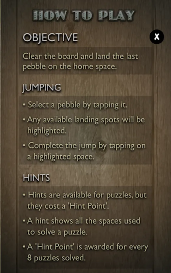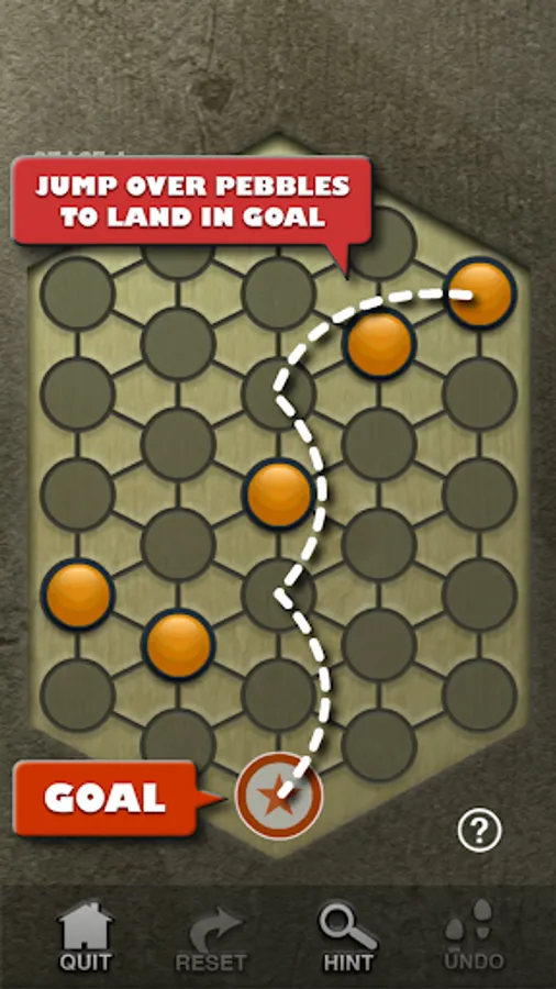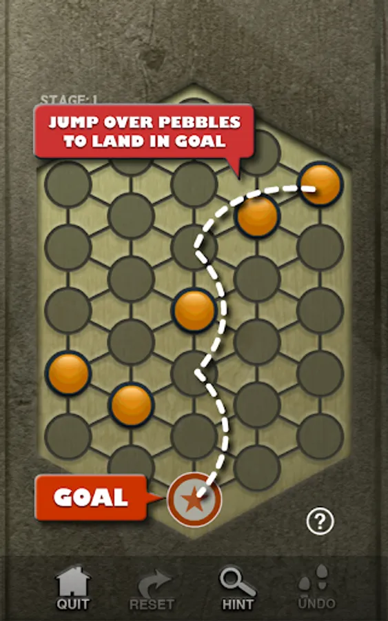 The objective of Pebble Jump is to clear the board by jumping over pieces in the style of 'Checkers'. The challenge is to land the last jump on the indicated 'home' space.