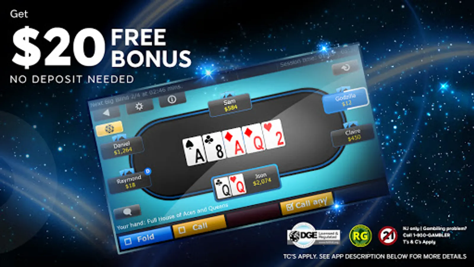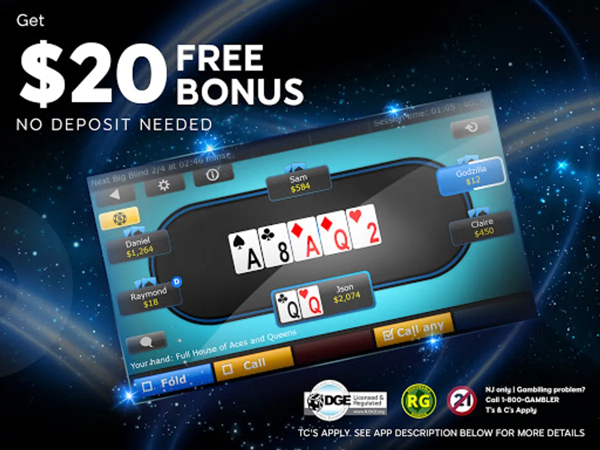 To be eligible for the Registration Bonus a player must: (i) be at least 21 years of age; (ii) complete the full registration process with 888poker.com; (iii) confirm his email address within 7 days.; (iv) be eligible under applicable law to play real-money games on 888poker; and (v) plays on 888poker within the State of New Jersey Players who register via 888poker are only eligible for one Registration Bonus and are not eligible for any other registration bonus offered by 888poker or us.888casino.com (“888casino”). The Registration Bonus shall consist of: $4 that shall be credited to the player’s bankroll, 6 Tournament Tickets with a value of $1 each and $10 free play for selected casino games on 888casino. The bonuses granted under this Promotion are applicable for new players only, and must be used within 7 days from being credited to a player’s account. Wagering requirements apply to your use of the $4 worth of money bonus, the Tournament Tickets and the $10 free play granted under the Promotion. For more information regarding the wagering requirements please see here: https://us.888poker.com/terms/poker-reg-bonus/. The Registration Bonus is subject to the Registration Bonus terms and conditions: https://us.888poker.com/terms/poker-reg-bonus/. Gambling problem? Call 1-800-Gambler