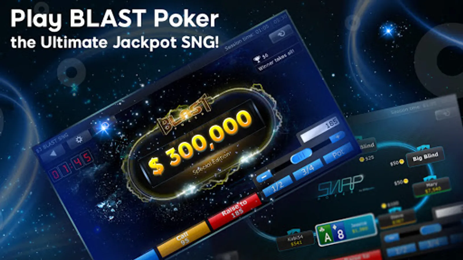 • BLAST – Jackpot Sit ‘n Go: Low buy-in, high reward. Win up to 10,000 times your buy-in every tournament!