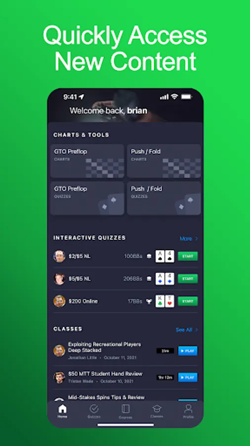 Master the game with preflop GTO Charts, Push/Fold Charts and Quizzes, Interactive Hand Quizzes, Video Classes, Webinars and more from top-level poker coaches with combined earnings of over $50 million.