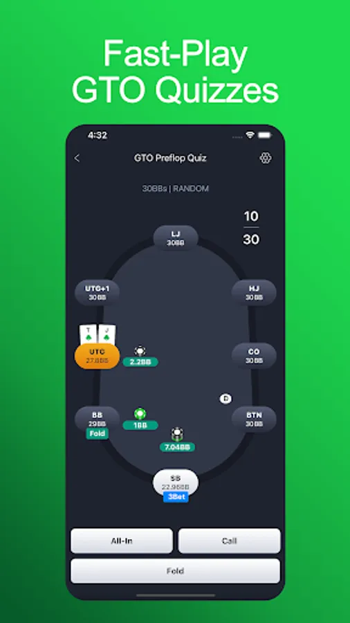 Test and improve your short stack skills with Push/Fold Quizzes. Master every Push/Fold decision from every position for stack sizes from 6 bbs - 15 bbs. Multiple difficulty settings make learning short stack strategy easy for players of all skill levels.