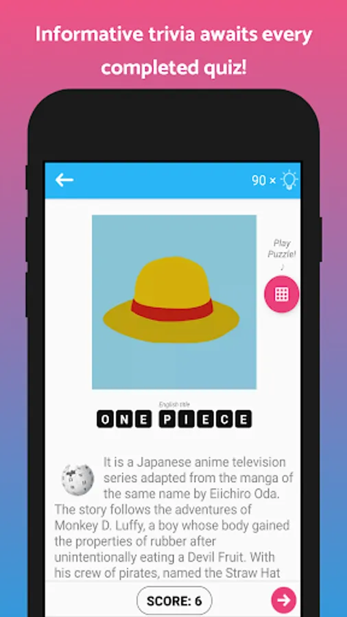 You will definitely enjoy playing this anime app with more than 200 anime titles. You also definitely discover new animes to watch with wide variety of genres. It will never get you bored! We also have anime trivia in each title as you complete them so while playing, you will also learn more about the anime's author, origin, synopsis, story plot, characters and many more.