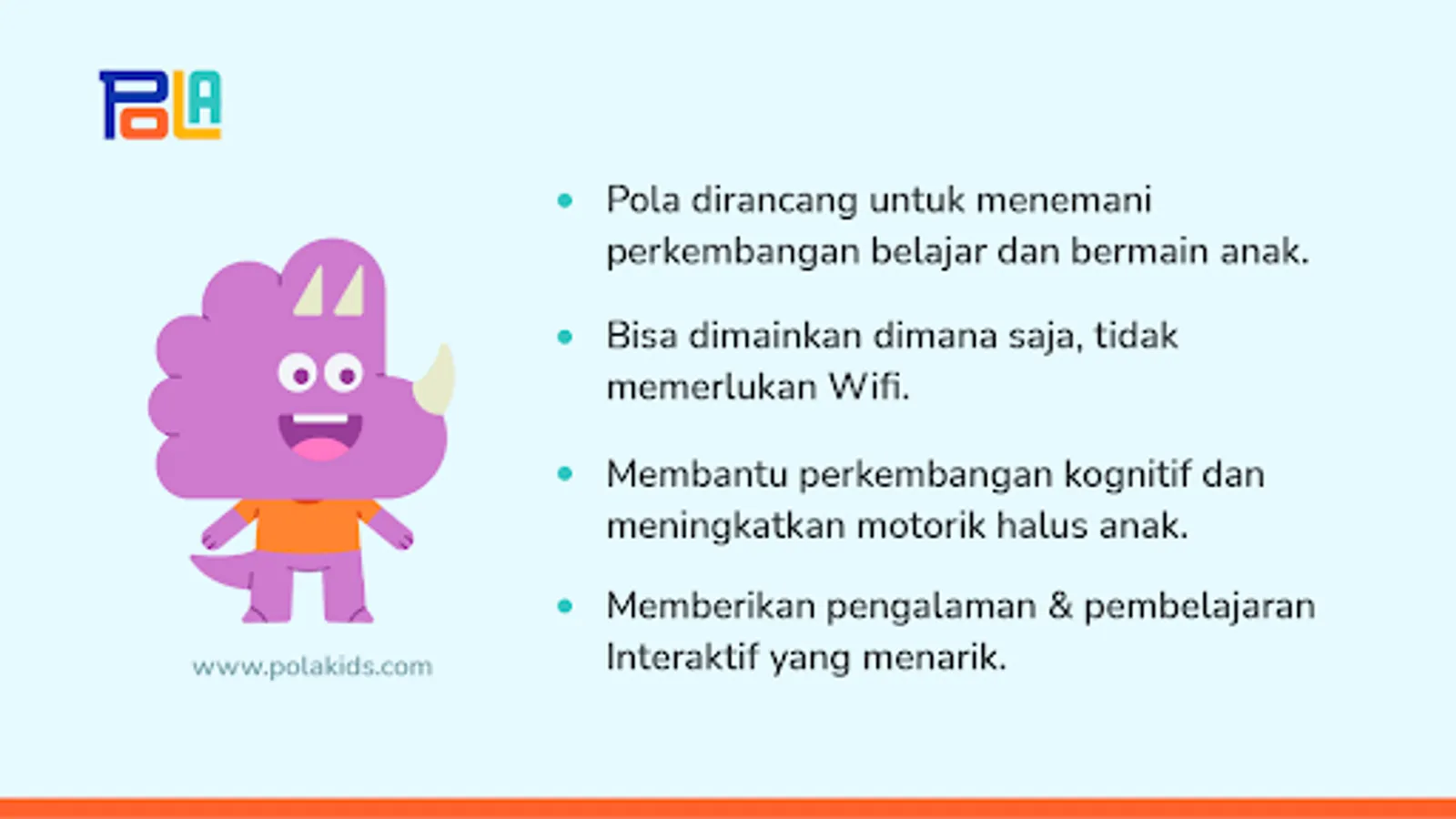 Aplikasi Pola dirancang untuk memberikan pengalaman belajar yang interaktif. Setiap aktivitas dalam aplikasi membantu meningkatkan kemampuan kognitif anak serta melatih daya ingat dan pemecahan masalah.