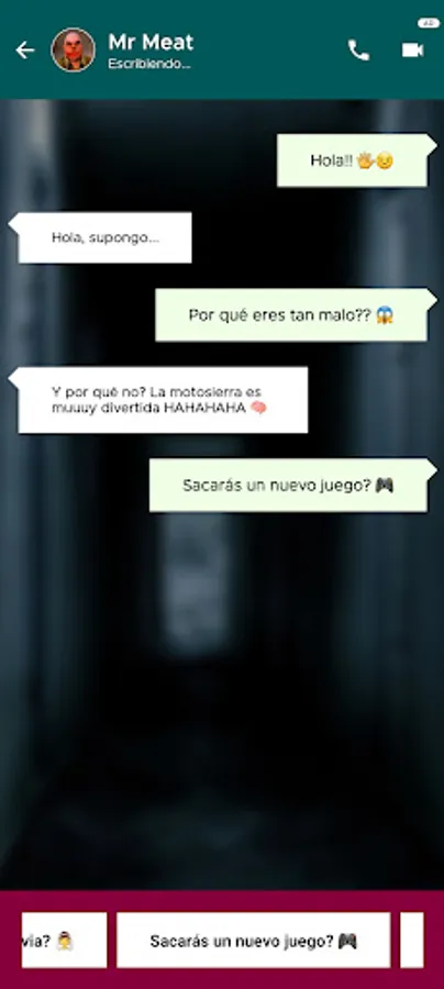 With this application you will be able to simulate a fake chat with Mr Meat to play a prank on your friends and make them believe that you have contact with the terrifying butcher Mr Meat! You can call him at 3 am, and you will terrify everyone around you...