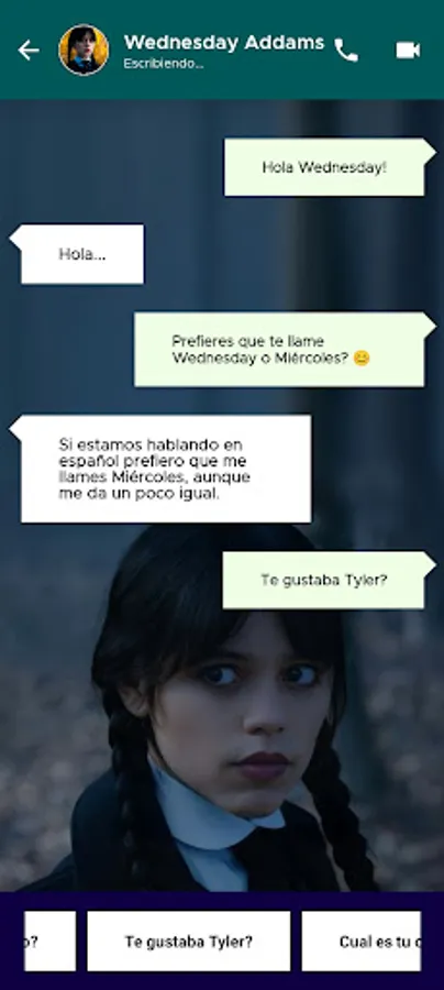 With this application you will be able to simulate a fake chat with Wednesday Addams (or Wednesday Addams) to play a prank on your friends and make them believe that you have contact with the girl Wednesday Addams (or Wednesday Addams)!