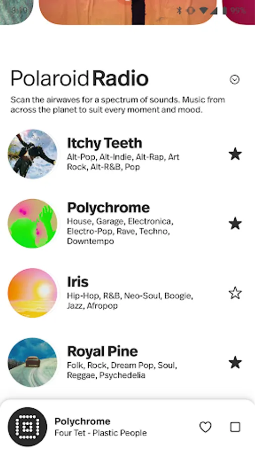 Unlock Polaroid Radio: five free and ad-free internet radio stations mixed by our creative friends.