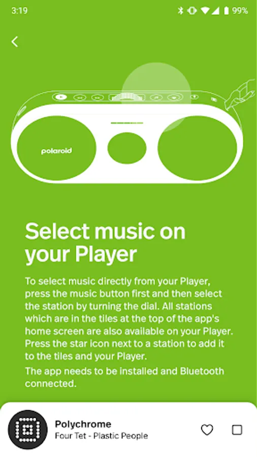 Polaroid Music acts as a companion app for Polaroid Speakers. Connect the app and control your Polaroid Speaker with its analog buttons. Now you can change the music, save your favorite internet radio stations, and adjust the sound directly on the player—without picking up your phone. Polaroid Music app also allows you to customize your Polaroid Speaker.