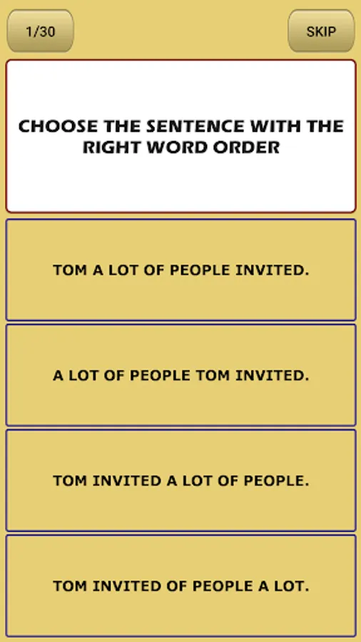 We have managed to put 20 English grammar units (for each level) in each test in a way that each question is a part of a certain unit.