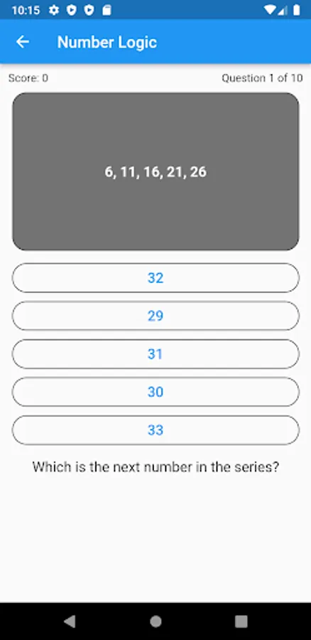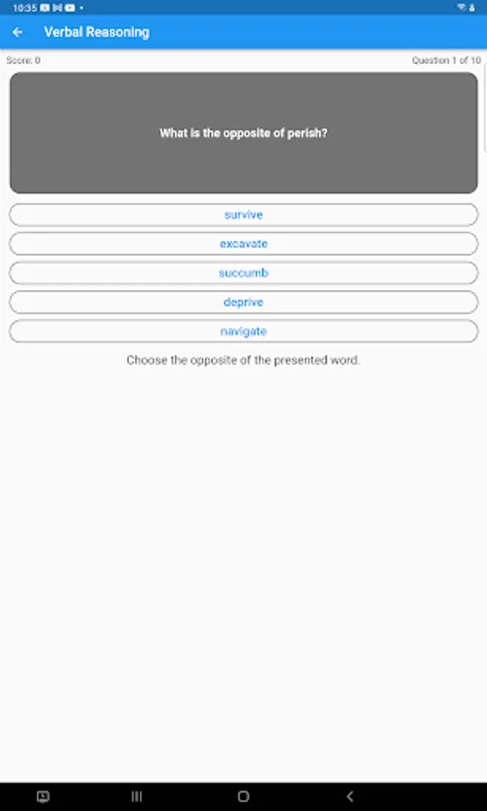 We present a quiz of 10 questions in 4 or 5 broad categories from a bank of questions stored in the app. You get a score and the number right/wrong as well as indication of correct answers when tapped. Some sections have a review that shows where you went wrong.