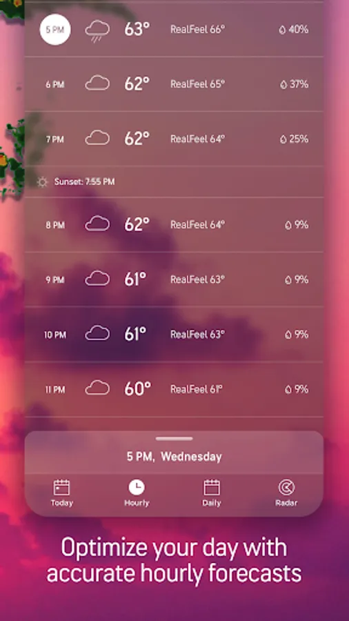 • Daily and Hourly forecasts include rain probability, wind, and RealFeel®