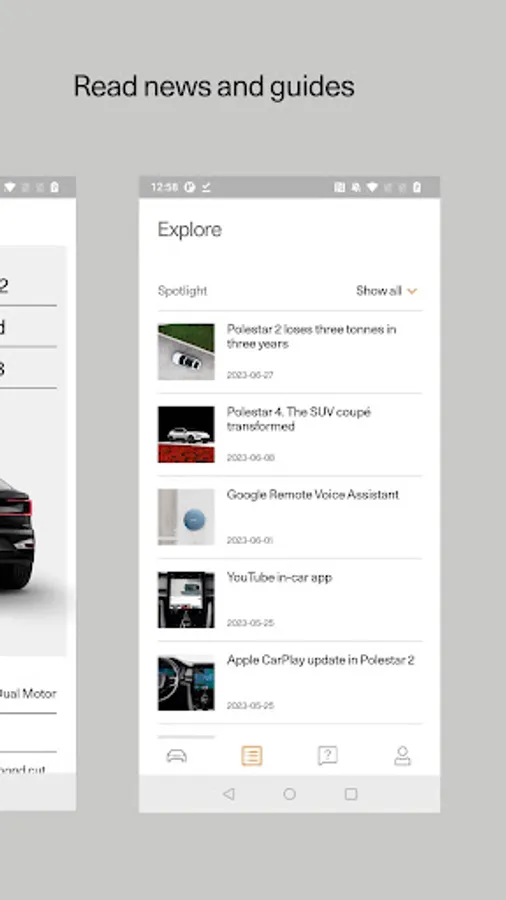 The Polestar app is your entry point into the Polestar universe. Configure a Polestar to your taste and buy it directly in the app, book a service, access a wide range of vehicle functionality, and explore your own personalized content feed. And with more new functions on the way, the Polestar digital experience will constantly improve.