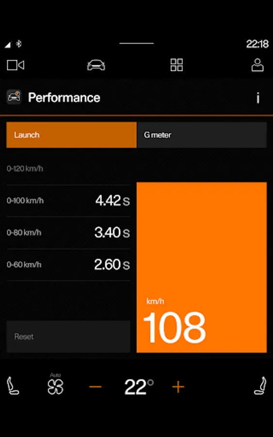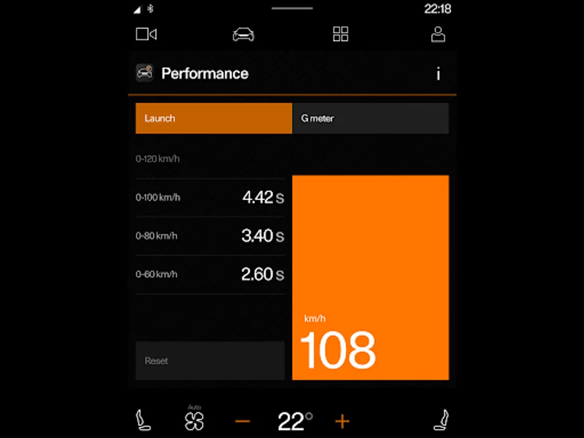 The Performance App adds a launch timer and g-meter to the Polestar 2 infotainment system, visualizing your driving experience. Purchase of the performance software upgrade unlocks full functionality.